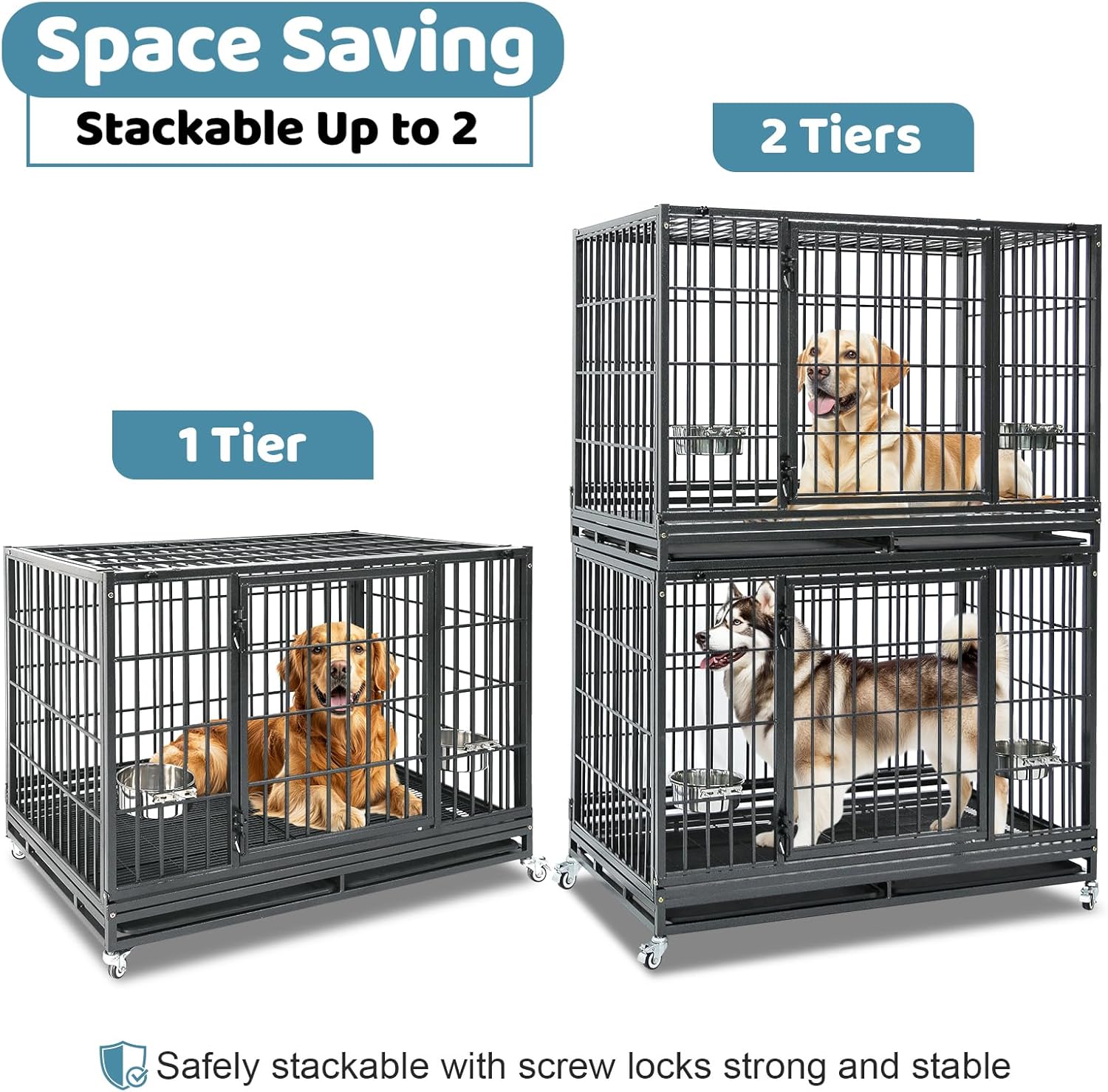- Stackable to Save Space: The 48 inch heavy duty dog kennel stacks up to 2 tiers with secure screw-locks—ideal for breeders, groomers, boarding facilities, and multi-dog homes