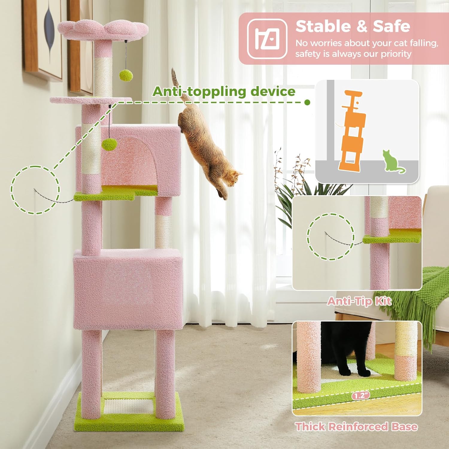 • Flower Cat Tree Design: With a flower-shaped top perch and refreshing pink and green tones, this flower cat tower blends cuteness and function. It features scratching posts, a sisal pad, cozy condos, and hanging pompoms—an all-in-one spot for climbing, scratching, and lounging.
