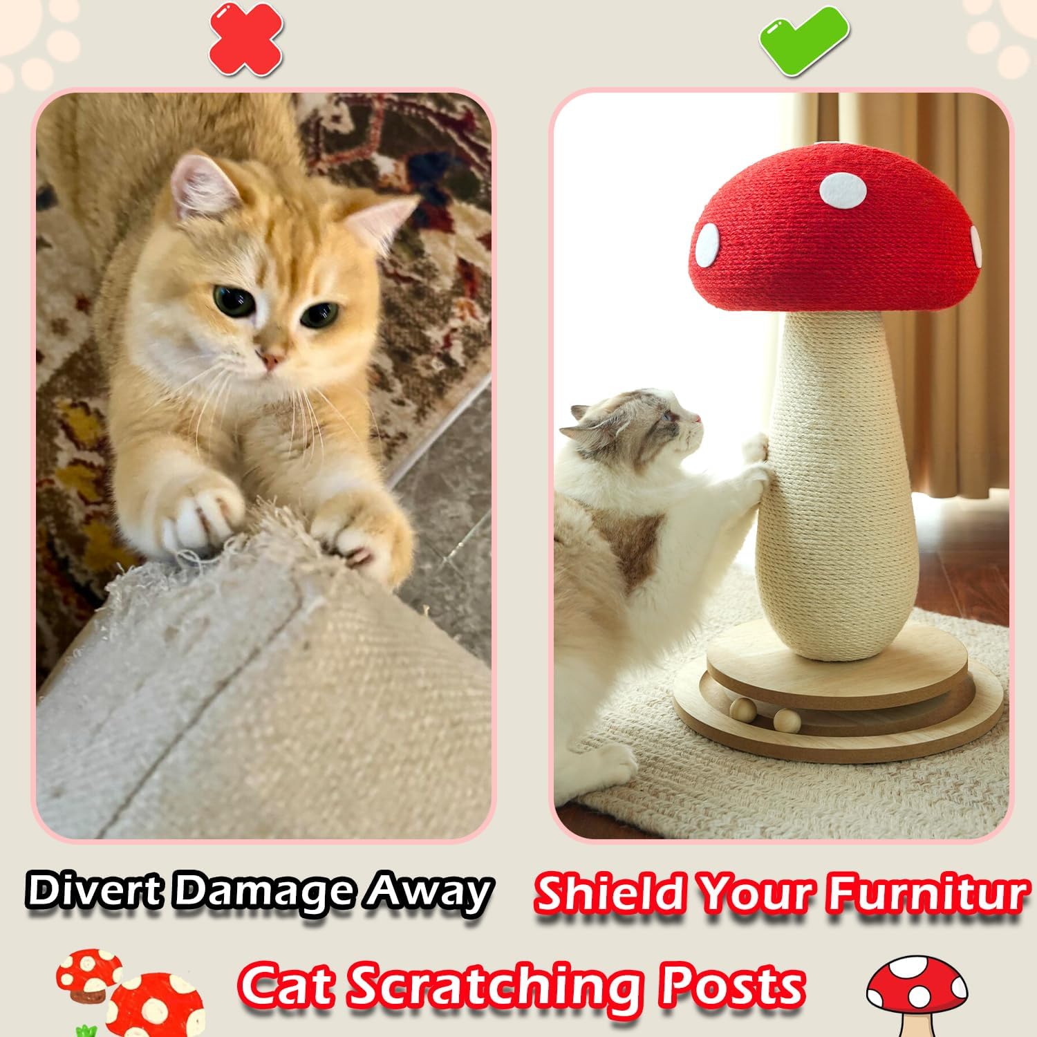 • 【Full-Body Natural Sisal for Instinctive Scratching & Furniture Protection】Top mushroom cap & center post wrapped in premium natural sisal - chosen for extreme durability and superior texture to satisfy scratching instincts 24/7; Permanently protects sofas/carpets