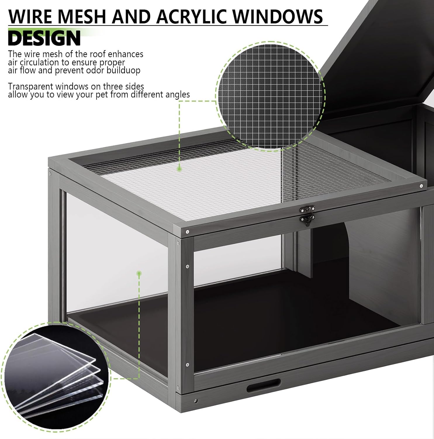 • ✨【Easy to Clean & Assemble】: Note: Lights are not included. The Tortoise Habitat is designed with a large removable plastic tray to prevent bottom rot, making maintenance hassle-free. With two operable top lids secured by wooden brackets, assembly takes only 20-30 minutes, ensuring convenience for pet owners