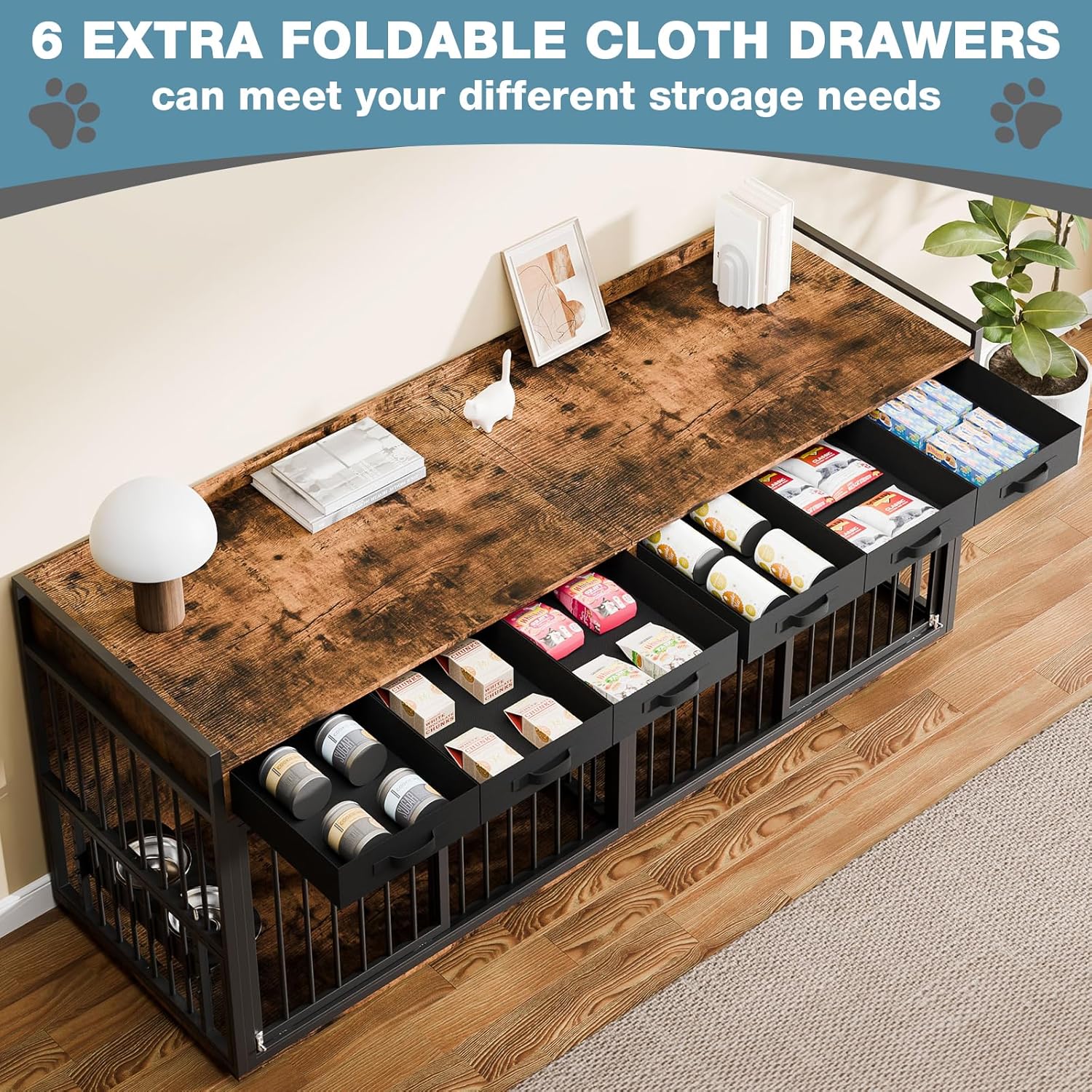 86.6Inch Large Double Dog Crate Furniture,Heavy Duty Metal Frame Dog Crate Kennel with Adjustable Feeder Bowls and Removable Divider&Drawers,Chew-Resistant Dog Kennel for 2 Dogs Indoor
