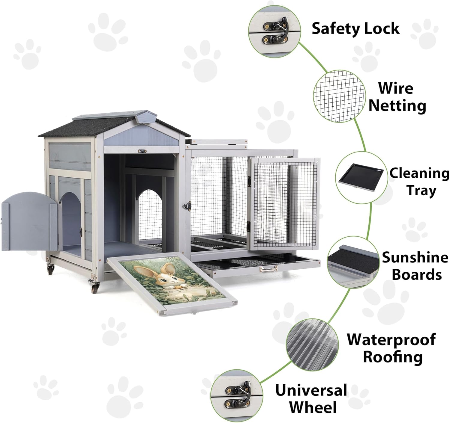 • Cleaning Trays:The bottom of the bunny hutch indoor comes with a cleaning tray made of PVC, which can be easily pulled out by the handle, making it easy for you to clean up the animal's faeces and ensure a clean and tidy environment inside the pet cage
