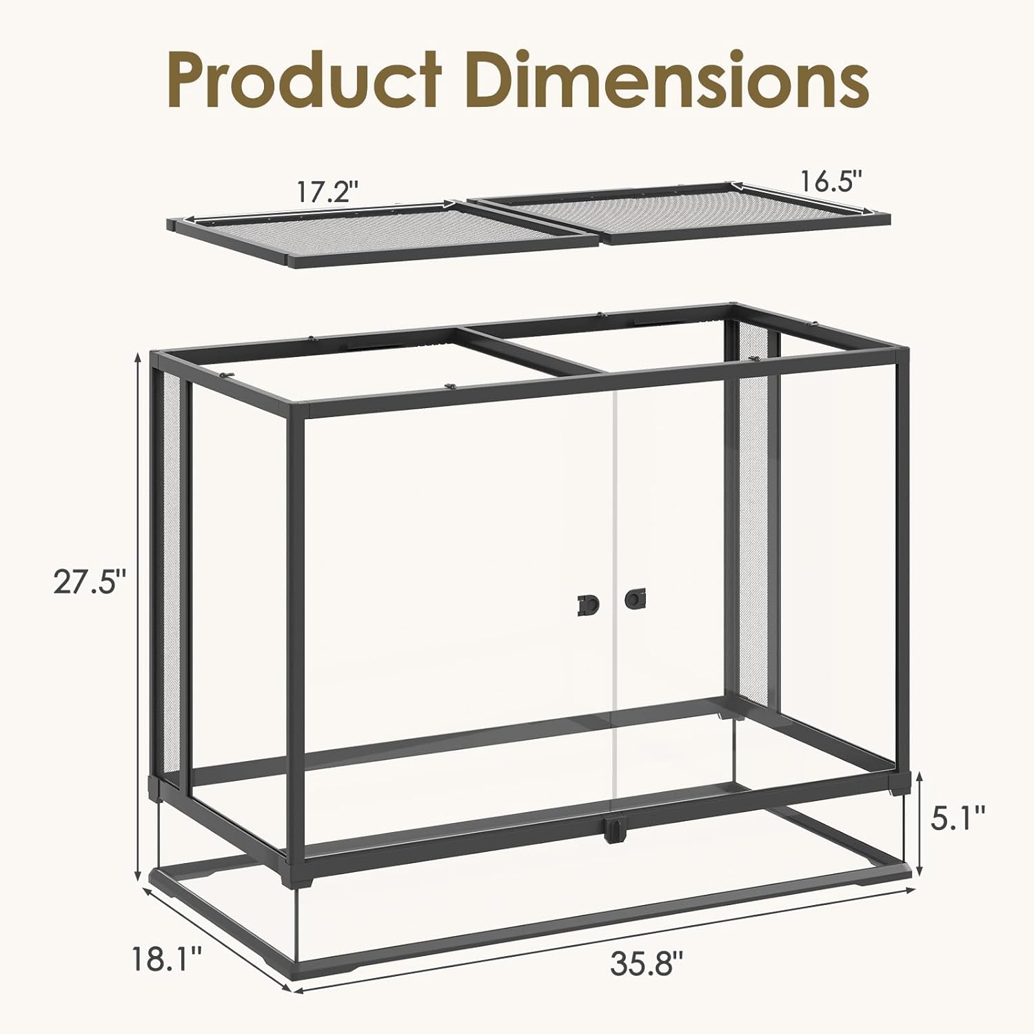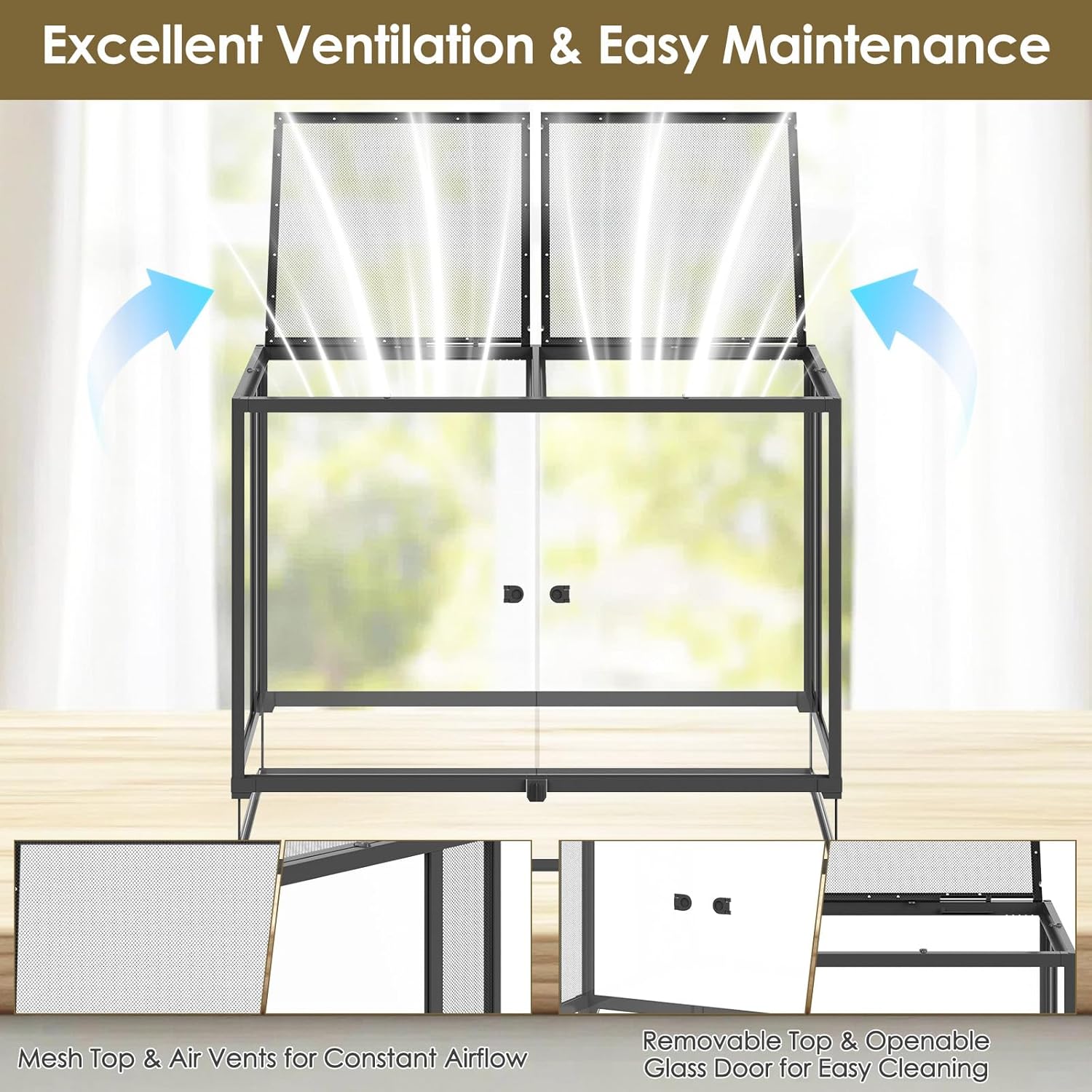 • Ventilated Design: Our reptile terrarium features interchangeable glass or mesh panels for rainforest or desert habitats, plus a mesh top and side vents for airflow. Removable lid and front-opening glass doors make feeding and cleaning simple