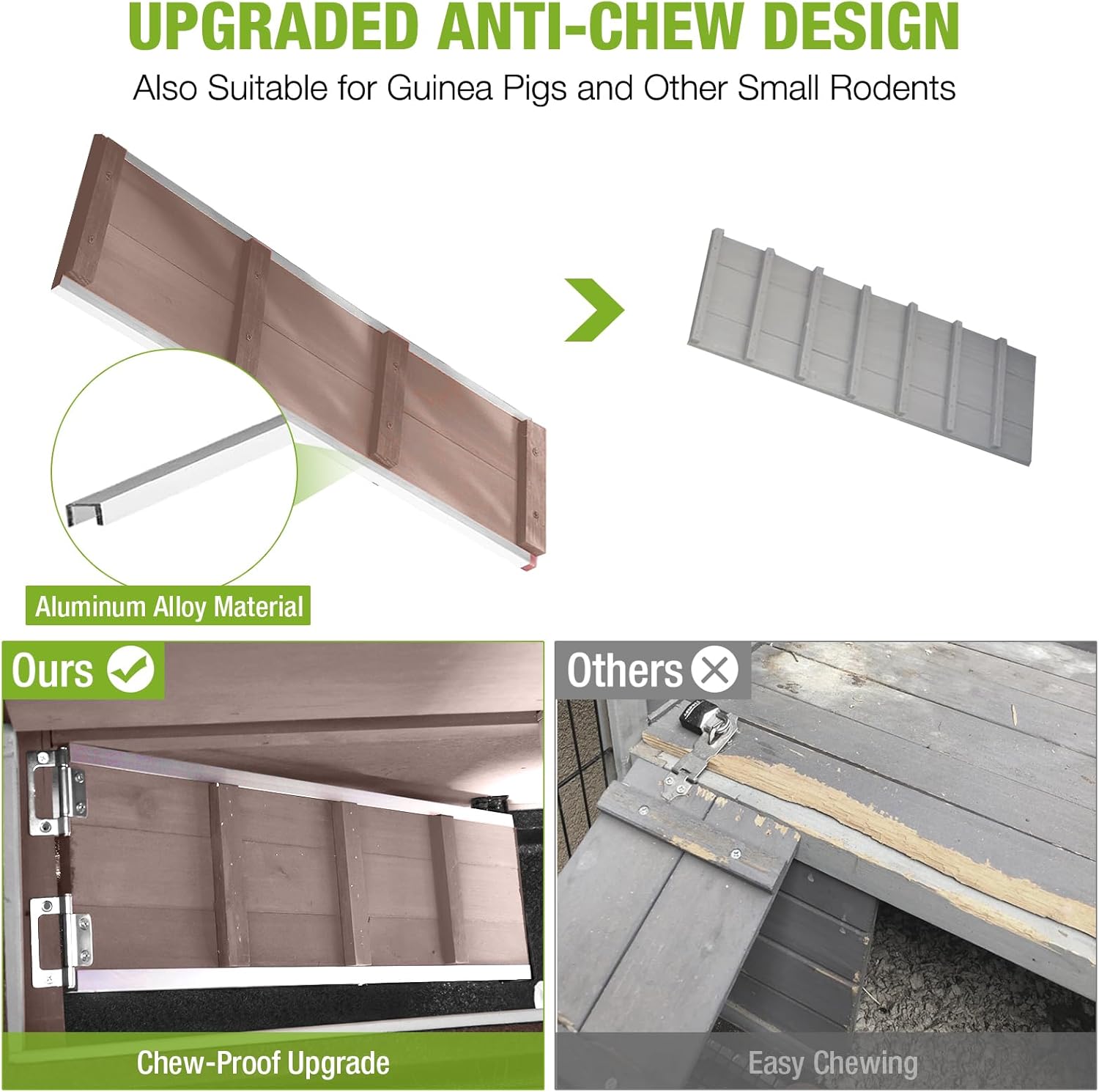 • Reinforced Chew-Proof Design: The access ramp features aluminum alloy-reinforced edges to discourage chewing by rabbits and other small pets, enhancing the rabbit hutch’s long-term durability. This sturdy design protects against wear and tear, ensuring lasting use