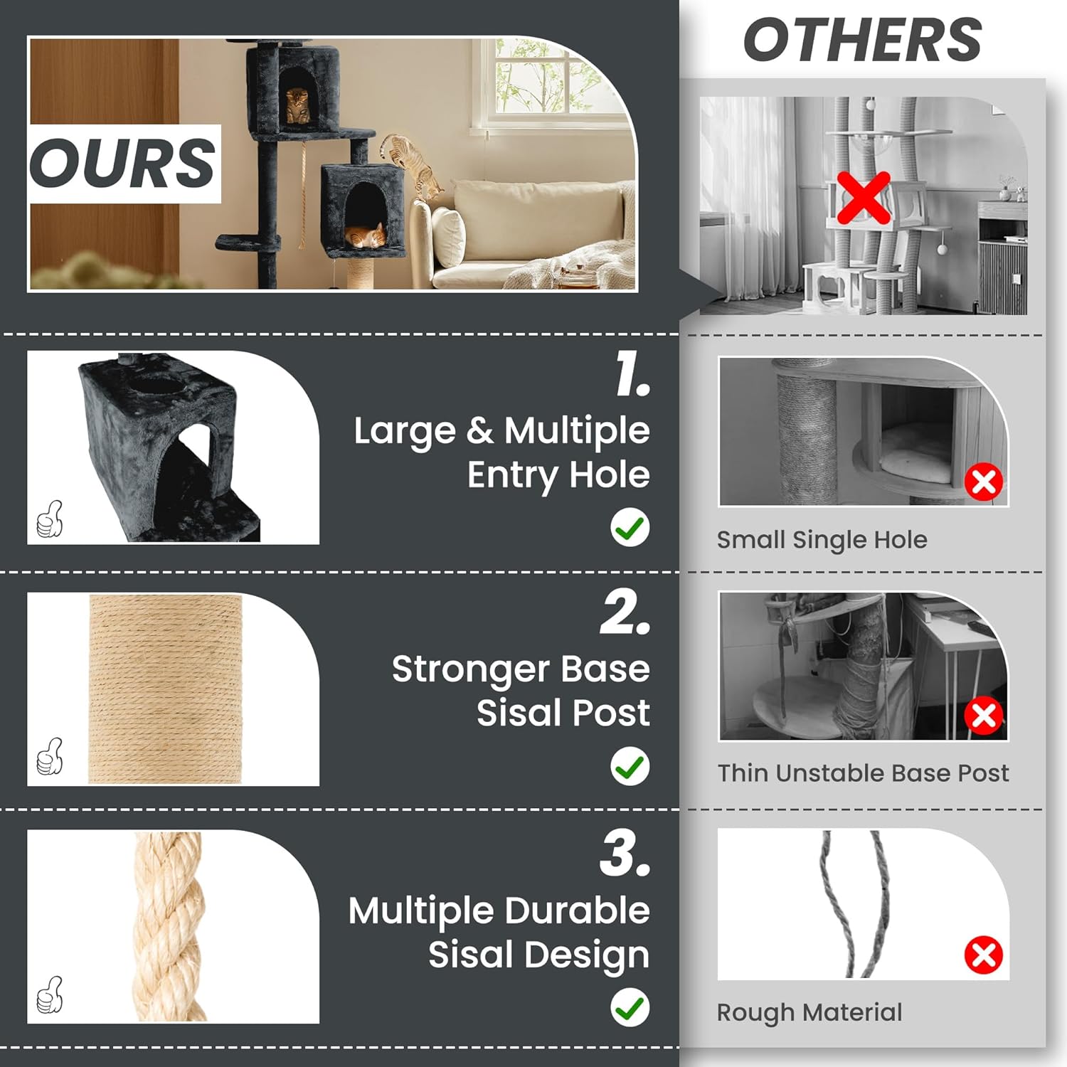 • 🐾[Spacious and comfortable Design]: 59 inch ultra large size cat tree, equipped with two independent cat condos, providing ample space for multiple cats to move and rest.