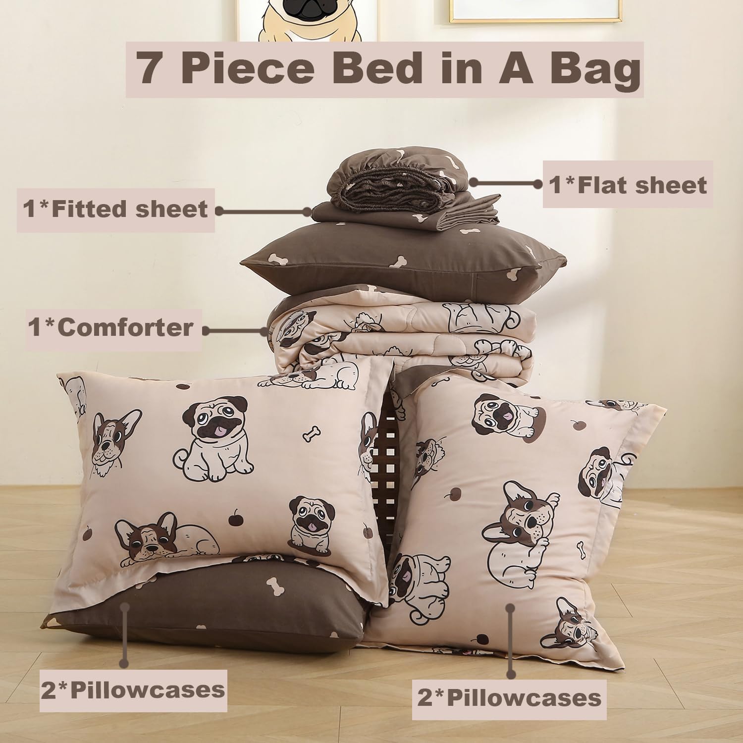 Kids Comforter Set 7 Piece Bedding Cute Dog Cartoon Animal Bed Microfiber Comforter Twin Size All Season (1 Comforter, 1 Flat Sheet, 1 Fitted Sheet, 4 Pillowcase)