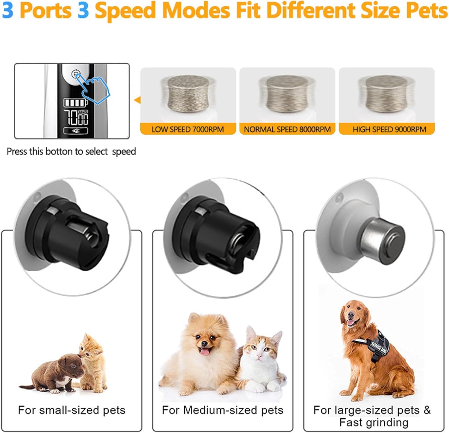 • 【Professional-Grade 3-Speed Control】Offers precise adjustment with Low (7000 RPM), Medium (8000 RPM), and High (9000 RPM) speed settings. Effortlessly tailor the power to your pet's size, nail thickness, and sensitivity for the most comfortable and efficient grooming experience.