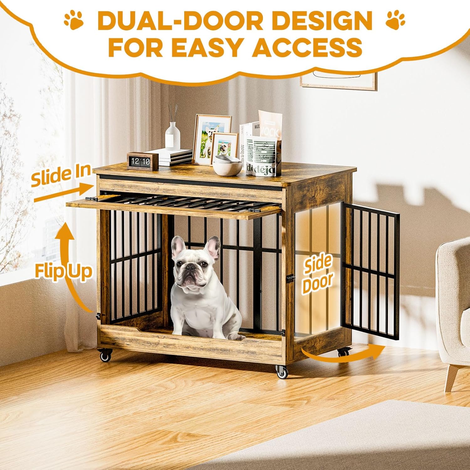 • Space-Saving Double Door: Features an innovative "lift-and-push" front door that opens upward, saving space and preventing accidents. Double door design offers easy access for cleaning, placing beds, or helping your pet in and out