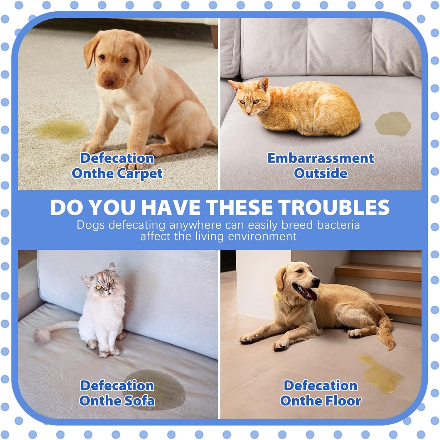 • Pet Potty Training Corrector - Our products can help you quickly shorten your dog's potty training time, whether you are doing puppy potty training or breaking old rules, it is a breeze. During the training process, be sure to reinforce good potty training behaviors with praise, petting and treats